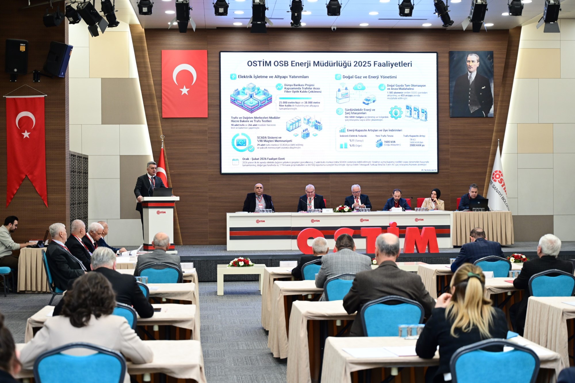 Genel kurulda OSTİM OSB Bölge Müdürü Adem Arıcı, 2025 yılı faaliyetleri ve 2026 çalışma programını sundu. OSTİM’deki değişim ve dönüşümü yönettiklerini belirten Arıcı, “Organize Sanayi Bölgeleri Kanunun bize vermiş olduğu altyapı, üstyapı, imar, elektrik ve doğal gaz dağıtımı faaliyetlerimizi kaliteli, kesintisiz ve rekabetçi bir anlayışla sürdürdük. 2025 yılı içerisinde buradaki yapılanmayı doğru yönlendirmek üzere hem ruhsatları hem izinleri düzenledik. OSTİM’in çehresini değiştirmek istiyoruz. Binalarımızın cephelerini ve kullanım şekillerini biraz daha büyüterek yapılaşmayı düzgün bir şekilde yapmaya gayret ediyoruz.” dedi.