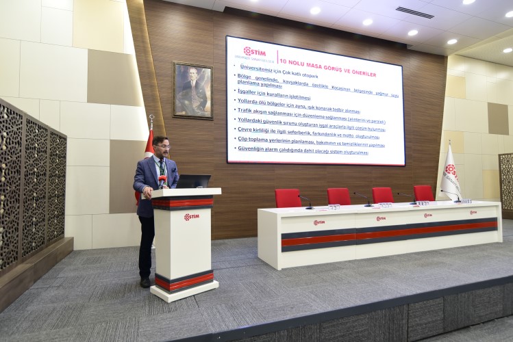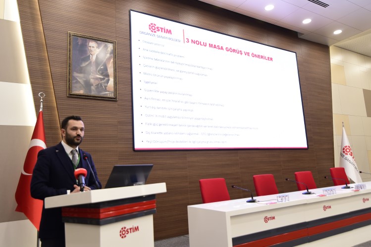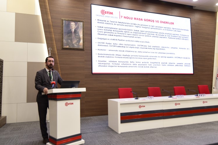 OSTİM Teknik Üniversitesi Rektör Yardımcısı Prof. Dr. Ünsal Sığrı’nın moderatörlüğünde gerçekleştirilen masa çalışmasında 200’e yakın katılımcı; imar ve altyapı, çevre, güvenlik, temizlik, elektrik ve doğalgaz, basın, tanıtım ve müşteri ilişkileri, kümelenmeler, mesleki ve teknik eğitim, istihdam, dış ticaret, sanayi-üniversite işbirliği, teknopark, dijitalleşme ve yeşil dönüşüm, proje destekleri, rekabetçi ve yenilikçi projeler başlıklarında görüş ve önerilerini paylaştı.